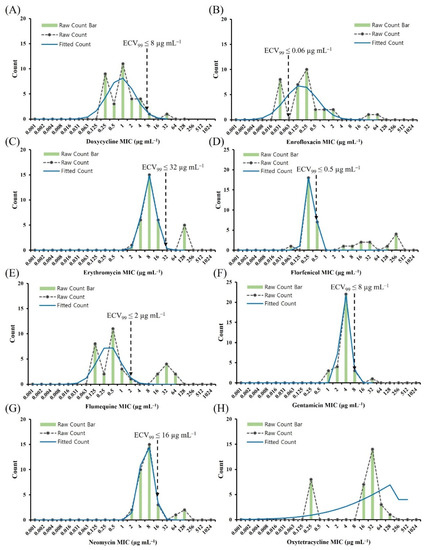 Antimicrobial susceptibility tests were performed according to the broth microdilution method described in the CLSI guidelines VET04 [17,18]. The antimicrobial agents for Aeromonas spp. isolates are licensed and commonly used for aquatic animals in Korea [38]. The MICs of 43 A. hydrophila and 33 A. veronii isolates were tested using Sensititre CAMPY2 and KRAQ1 plates (Trek Diagnostics System, Cleveland, OH, USA). MICs for erythromycin (0.03–64 mg L−1), florfenicol (0.03–64 mg L−1), and gentamicin (0.12–32 mg L−1) were tested using CAMPY2; and those for doxycycline (0.25–64 mg L−1), enrofloxacin (0.03–32 mg L−1), flumequine (0.12–128 mg L−1), neomycin (0.5–64 mg L−1), and oxytetracycline (0.25–256 mg L−1) were tested using KRAQ1. Isolates were cultured on tryptic soy agar for 24 h at 28 °C, after which a suspension was prepared in sterile saline solution, adjusted to 0.5 McFarland standard, and diluted to reach a final inoculum concentration of 5 × 105 CFU/mL using a Nephelometer® (V3011, Thermo Scientific, Roskilde, Denmark)) to standardize inoculum density/turbidity. Microplates were incubated at 28 °C for 24 h for A. hydrophila and A. veronii. MICs were defined as the lowest drug concentrations that inhibited growth, compared to that in the drug-free growth control. E. coli ATCC 25922, A. salmonicida subsp. salmonicida ATCC 33658, and E. faecalis ATCC 29212 were included in the susceptibility test as QC strains. Recently, additional MICs of ECVs were made available for A. hydrophila in the updated CLSI guidelines [18]. We compared the A. hydrophila and A. veronii isolates among WT and NWT populations, according to the CLSI guidelines and the provisional ECVs proposed in this study.