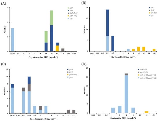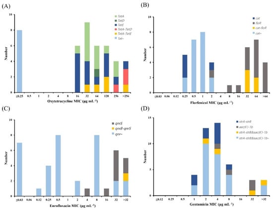 We analyzed four tet genes (tetA, tetB, tetD, and tetE) encoding proteins involved in tetracycline efflux (Figure 5). In A. hydrophila, all the tet-positive isolates (35 isolates) were oxytetracycline NWT at ECVCLSI (Figure 5A). The most common tet gene was tetE, which was found in 14 (40%) NWT isolates, followed by tetA, which was found in 12 (34.3%) NWT isolates. Some of the isolates carried more than one tet gene, with tetA–tetD (three isolates) and tetA–tetE (five isolates) related to the oxytetracycline MICs ranging from 32 µg mL−1 to 256 µg mL−1 and demonstrating high resistance to oxytetracycline. The tetB gene was not detected in any of the strains. We analyzed the four tet genes in A. veronii (Figure 6). In A. veronii, all the tet-positive isolates (25 isolates) were oxytetracycline NWT at ECVNRI (Figure 6A), and the most common tet gene was tetE, which was found in 13 (52%) of the NWT isolates. Additionally, A. veronii isolates with MICs of 64 µg mL−1 (two strains) and 128 µg mL−1 (one strain) carried two tet genes, (tetA–tetE and tetD–tetE, respectively). The tetB gene was not detected in any of the strains.