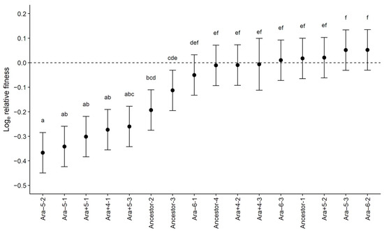 Fitness of 16 ampicillin-resistant mutants, each relative to its parental strain. The mutants are arranged from lowest to highest fitness. Each symbol shows the mean loge-transformed fitness based on five-fold replication of paired assays. Error bars show 95% confidence limits calculated using the t-distribution with 4 d.f. and the pooled standard deviation from the ANOVA (Table 1). Letters above the error bars identify sets of mutants with relative fitness values that do not differ significantly, based on Tukey’s “honest significant difference” test for multiple comparisons. The dashed line shows the expected relative fitness under the null hypothesis of no cost of resistance.