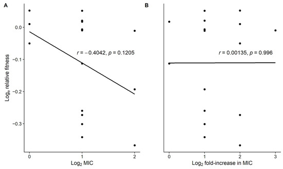 Variation in relative fitness of ampicillin-resistant mutants is not significantly correlated with their resistance level. Correlation between the mean loge-transformed fitness of 16 ampicillin-resistant mutants and their (A) log2-transformed minimum inhibitory concentration (MIC), and (B) log2-transformed increase in resistance relative to their parental clones after a single round of drug selection [16].