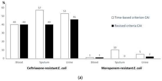 The information on AMR surveillance of bacterial isolates recovered in clinical specimens in 2020 observed in the present study may not be appropriate for developing local guidelines for antibiotic use until two important issues related to the validity of such information are resolved. First, the best practices in specimen collection without specimen contamination should be adopted. This oversight was confirmed by the high prevalence of E. coli isolated from sputum specimens. Furthermore, the overall prevalence of colonized bacteria in this study (4%) is much lower than what was observed in previous studies (30–60%) [7,8,9]. It is reasonable to think that many isolates in this study were misclassified as true pathogens and were included in the AST results of 2020. Second, hospital personnel who retrieve information on MDR risk should improve their skill in classifying CAI. The data in Table 1, Table 2, Table 3, Table 4 and Table 5 show that the resistance of isolates in CAI classified by the 2-day cutoff criteria was high. For example (Figure 1), the prevalence of ceftriaxone-resistant E. coli isolated from urine in CAI was 53% when the time-based criterion was used and 46% when the revised criteria (time-based criterion with MDR risk) were used. This indicated that the 2-day cutoff criterion used to differentiate CAI and HAI is not sufficient and that MDR risk might be assessed inappropriately in all CAIs classified by the 2-day cutoff criterion. This phenomenon will have a huge impact on the recommendation of antibiotics for therapy of a suspected urinary tract infection (UTI) due to E. coli because the recommended first-line antibiotic is piperacillin/tazobactam, meropenem, or amikacin instead of ceftriaxone if the susceptibility of E. coli from urine specimens to ceftriaxone is only 47–53%. Usually, ceftriaxone is recommended as the first-line antimicrobial for empiric therapy of a community-acquired UTI because most isolates of E. coli causing a community-acquired UTI have remained susceptible to ceftriaxone in many studies [5]. Further evidence suggesting misclassification of HAI as CAI was that 4% of S. aureus isolates from blood and sputum specimens from CAI patients were MRSA. Community-associated MRSA is extremely rare in Thailand; therefore, these patients were more likely to have had HAI instead of CAI [10,11].