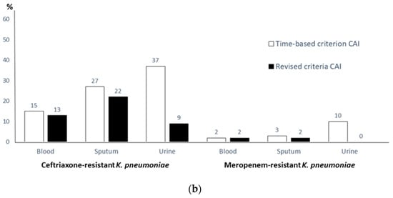 Prevalence of resistant bacteria when using GLASS-based CAI criteria (only time-based criterion) and revised criteria of CAI (time-based criterion with MDR risk). (a) Ceftriaxone-resistant E. coli and meropenem-resistant E. coli; (b) ceftriaxone-resistant K. pneumoniae and meropenem-resistant K. pneumoniae.