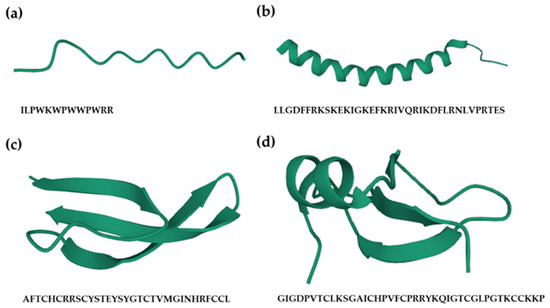 Structures of antimicrobial peptides (AMPs). Based on their structures, AMPs can be divided into four categories, including (a) linear peptide, e.g., bovine antimicrobial peptide indolicidin (protein databank, PDB: 1G8C); (b) α-helical peptide, e.g., human host defense cathelicidin LL-37 (PDB: 2K6O); (c) β-sheeted peptide, e.g., human α-defensin-6 (PDB: 1ZMQ); (d) peptide including both α-helix and β-sheet, e.g., human β-defensin-2 (PDB: 1fd3). All the figures were created using an online 3D view (https://www.rcsb.org/3d-view, accessed on 1 December 2021).