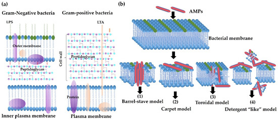 Bacterial membrane structures and mechanisms of action of antimicrobial peptides (AMPs). (a) Schematic membrane structures of Gram-positive and Gram-negative bacteria. The cytoplasmic membranes of them are similar. Gram-negative bacteria have a thin layer of peptidoglycan, with lipopolysaccharide (LPS) in the outer membrane. In contrast, Gram-positive bacteria have a thick layer of peptidoglycan surrounding the cytoplasmic membrane, with lipoteichoic acid (LTA) across the peptidoglycan layer. Both LPS and LTA are the binding targets of AMPs. (b) Mechanisms of action of AMPs. Membrane-active AMPs interrupt the integrity of the membrane by forming different pores as in the following models: (1) Barrel-Stave model: AMPs perpendicularly insert into the lipid bilayer of the membrane and form a channel. (2) Carpet model: AMPs cover the surface of the membrane without forming specific pores. (3) Toroidal pore model: AMPs also insert perpendicularly in the lipid bilayer without specific peptide–peptide interactions to form a channel. (4) Detergent-like mode: AMPs work like a detergent to break membranes into small pieces.