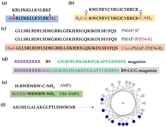 Modification of antimicrobial peptides (AMPs). (a) Substitution natural L-amino acids with D- or unnatural amino acids. Aib and Thi denote 4-aminobutanoic acid and L-thienylalanine, respectively. (b) N-terminal acetylation and C-terminal amidation of tachyplesin I. (c) N-terminal cholesterol-modified peptide PMAP-37 (F34-R). (d) Conjugation of R9 (RRRRRRRRR) with magainin (GIGKWLHSAKKFGKAFVGEIMNS) with three glycines (Gly, G). (e) Organometallic AMPs (OM-AMPs). (f) Design of a helical structure of AMP.