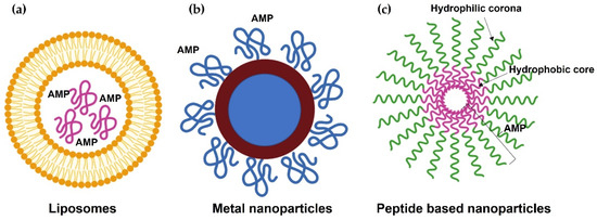 Delivery of antimicrobial peptides (AMPs) by nanoparticles. (a) Liposomal system for AMP delivery. (b) Metal-based nanoparticles for AMP delivery. (c) Self-assembling nanoparticles.
