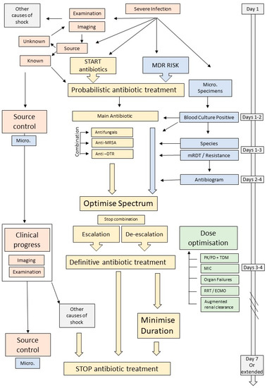 - Timsit, J.F.; Bassetti, M.; Cremer, O.; Daikos, G.; de Waele, J.; Kallil, A.; Kipnis, E.; Kollef, M.; Laupland, K.; Paiva, J.A.; et al. Rationalizing antimicrobial therapy in the ICU: A narrative review. Intensive Care Med. 2019, 45, 172–189. [Google Scholar] [CrossRef]