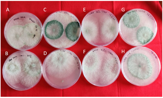 Interaction of Bg_9562 protein and TAIK1 mycelial discs at varied temperatures and incubation periods: (A,B) 6 h incubation at 45 °C, 35 °C; (C,D) 12 h incubation at 45 °C, 35 °C; (E,F) 24 h incubation at 45 °C, 35 °C; (G) untreated protein (positive control); (H) TAIK1 (negative control); no effect of protein on mycelial growth. Observations taken after 24 h.