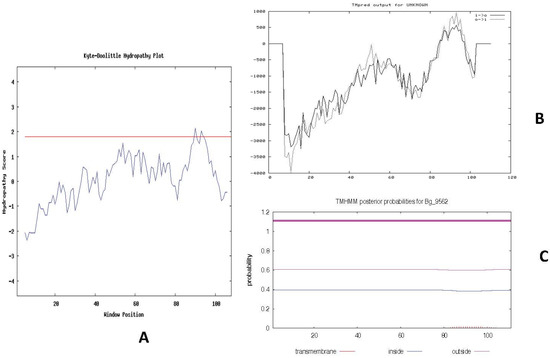 Using predictive tools available at Antimicrobial Peptide Database v2.34, it was found that Bg_9562 has antimicrobial activity (Table 2). The Boman index [19] estimated the protein binding potential of Bg_9562 as 1.27 kcal/mol, which indicates the potential affinity of Bg_9562 with other proteins in the cell. A higher Boman index value (>2.48) indicates that a given antimicrobial protein will be multifunctional or will play a variety of different roles within the cell due to its ability to interact with a wide range of proteins, while a low or negative Boman index value indicates a less effective antimicrobial protein. Another tool at ADP, which estimated the hydrophobicity if the amino acid contributed favorably to membrane interface partitioning of peptides, was determined by the Wimley–White scale for interfacial insertions. Interestingly, Bg_9562 displayed a high Wimley–White whole-residue hydrophobicity value of 26.18 kcal/mol, indicating that it is hydrophobic. Furthermore, it indicated that it has a better possibility of interacting and perturbing the membrane, which is the main target of action of many antimicrobial proteins. A hydropathy plot drawn using the Kyte and Doolittle scale (Table S4) (Figure 4A) predicted hydrophobic regions with a single transmembrane region in Bg_9562. Similar results were obtained with hydrophobicity (Kyte and Doolittle) estimated using the Protscale tool (Table S6), indicating the hydrophobic nature of Bg_9562. The transmembrane nature of Bg_9562 was determined using TMPred (Transmembrane Predictor) software and TMHMM-2.0 server (prediction of transmembrane helices in protein). Both the tools detected a single transmembrane region in the protein Bg_9562 between 83 to 102 amino acid positions (Figure 4B,C).