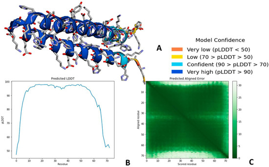 AlphaFold 2 also predicted a highly accurate structure of Bg_9562. The three outputs of AlphaFold 2 are represented in Figure 6. The first output is the 3D coordinates of Bg_9562 (Figure 6A). The second output is per residue confidence metric, called pLDDT, that corresponds to the model’s predicted score on the LDDT-Cα metric, which is usually in the range of 0–100. The Local Distance Difference test (LDDT) score is computed using only distances between Cα atoms in the protein model. The obtained model for Bg_9562 was found to be highly accurate, possessing the regions with pLDDT > 90. The third output was Predicted Aligned Error, which is required to assess the confidence in the domain packing and large-scale topology of the protein. The dark green color indicated low error in predicted domains and relative orientations of Bg_9562 (Figure 6C).