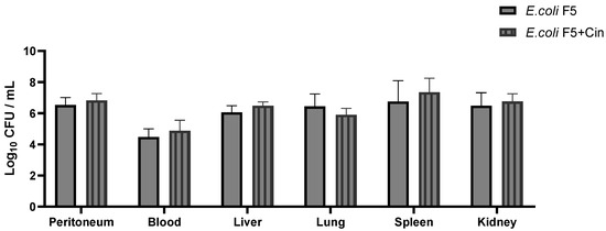 CFU counting from blood, peritoneal lavage, lungs, liver, spleen, and kidneys from animals infected with E. coli F5 and cinnamaldehyde treatment. The animals used in the experiment were distributed into 4 groups (n = 6). The groups received E. coli F5 or E. coli F5 followed by cinnamaldehyde treatment 60 mg/kg after two hours. After 10 h, the mice were euthanized. Aliquots of peritoneal fluid and blood were diluted in sterile PBS and serial dilutions were cultivated on MacConkey for evaluation of CFU. To quantify bacteria in the organs, part of them were macerated, and dilutions were cultivated on MacConkey. After overnight incubation at 37 °C, the CFUs were counted, and the results expressed as Log of CFU/mL.