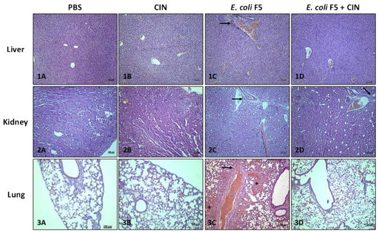 Histological analyses from liver, lungs, and kidneys of the animals infected with E. coli F5 presented cellular infiltrate, hemorrhage, and edema. However, the treatment with cinnamaldehyde (60 mg/kg) reduced tissue damage. Probably, the animals survived longer due to the decrease in lung inflammation induced by the compound.
