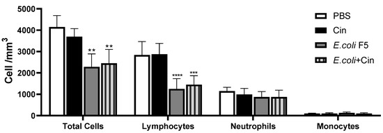 Total and differential blood cell counts from animals infected with E. coli F5 and cinnamaldehyde treatment. Ten hours after peritoneal inoculation of E. coli F5, blood samples were collected for total and differential cell counting. The results represent the mean ± S.D. of 6 animals/group. ** p < 0.01 as compared with the PBS group, *** p < 0.001 as compared with the PBS group, and **** p < 0.0001 as compared with the PBS group.
