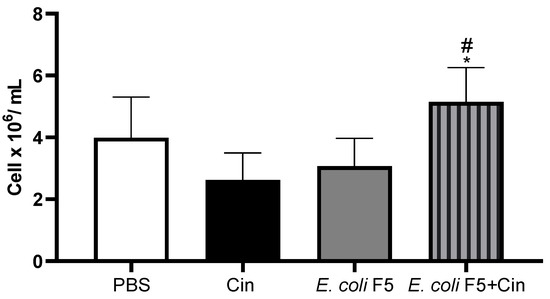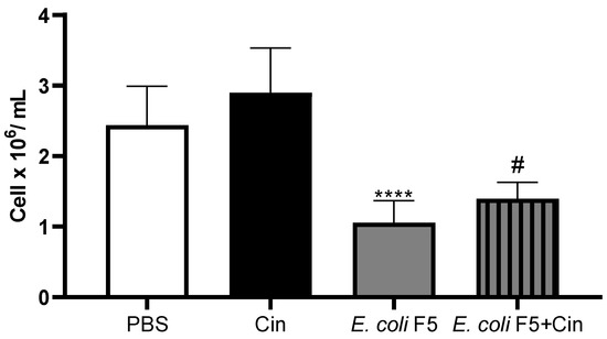 Peritoneal cell counts of animals infected with E. coli F5 and cinnamaldehyde treatment. Ten hours after peritoneal inoculation of E. coli F5, the peritoneal cells of the mice were collected from the lavage of the peritoneal cavity. The cells were stained with 0.05% violet crystal in 30% acetic acid and counted under a light microscope. The results represent the mean ± S.D. of 6 animals/group. **** p < 0.0001 as compared with the CIN group and # p < 0.05 as compared with the E. coli F5 group.