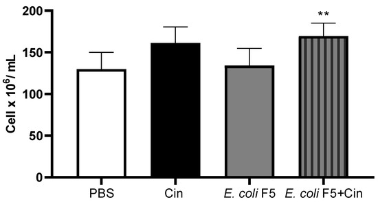 Total spleen cell counts from animals infected with E. coli F5 and cinnamaldehyde treatment. Ten hours after peritoneal inoculation of E. coli F5, spleen cells were obtained by removing and macerating the organ using PBS. The cells were stained with 0.05% violet crystal in 30% acetic acid and counted under a light microscope. The results represent the mean ± S.D. of 6 animals/group. ** p < 0.05 as compared with the E. coli F5 group.