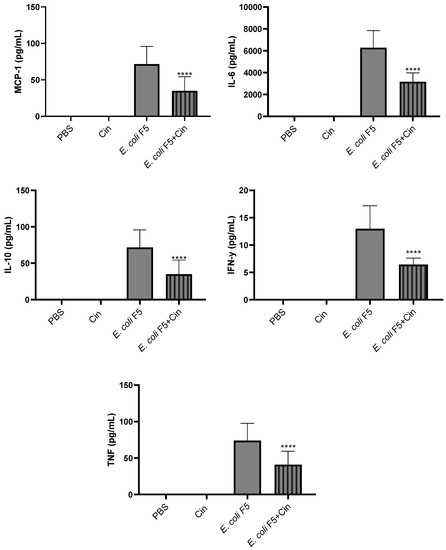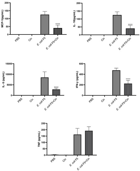 Detection of cytokines in the sera of animals infected with E. coli F5 and cinnamaldehyde treatment. Ten hours after peritoneal inoculation of E. coli F5, animal sera were used for cytokines dosage by flow cytometry. The results represent the mean ± S.D. of 6 animals/group. **** p < 0.0001 as compared with the E. coli F5 group.