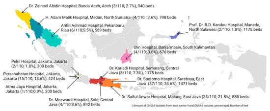 Distribution of CNSAB isolates with confirmed gyrB gene from each hospital in Indonesia (n = 110). The percentage is calculated as the number of gyrB-positive isolates from each hospital divided by the total number of isolates carrying the gyrB in this study. The number of beds from each hospital are provided to increase understanding of the profile of the study site.