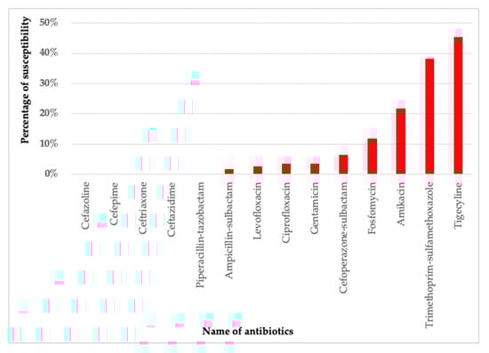 Our data suggested that tigecycline was the most susceptive to CNSAB isolates followed by trimethoprim-sulfamethoxazole (TMP-SMX), amikacin, and fosfomycin. Out of 110 CNSAB isolates, less than half were sensitive to tigecycline (45.5%, 50/110) and TMP-SMX (38.2%, 42/110) (Figure 2). Most of the CNSAB isolates were resistant to cephalosporins, fluroquinolone, aminoglycosides, and beta-lactam/beta-lactamase inhibitor antibiotics.