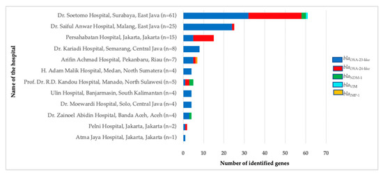 In our study, besides the intrinsic blaOXA-51-like gene, the most prevalent carbapenemase gene identified in CNSAB isolates was blaOXA-23-like. This is consistent with previous small studies from Indonesia [24,35] and other countries around the world [31,36,37,38,39]. Overall, 24.6% of CNSAB isolates had more than one carbapenemase gene, and this could contribute to an increase in minimum inhibitory concentration (MIC) due to higher hydrolytic activity, which may eventually lead to high resistance to beta lactam antibiotics [38]. The blaOXA-24-like gene was the second most prevalent in our study, and this gene was predominant in two hospitals: Persahabatan Hospital and Kandou Hospital, located in Jakarta and North Sulawesi, respectively. This is not surprising, since studies in other countries such as Spain and Portugal also have found that blaOXA-24-like could be the predominant gene [40,41].