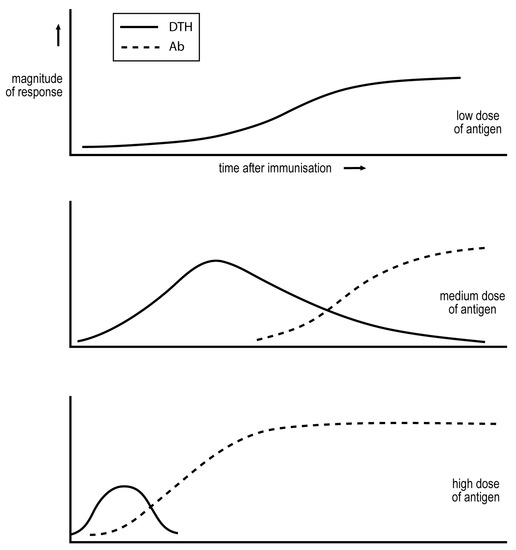 A classic study by Salvin of the late-1950s delineated how the dose of antigen, and time after immunization, affects the cell-mediated/IgG nature of the response [11]. Salvin measured DTH to assess cell-mediated immunity, and IgG antibodies to assess the humoral component of the response. His observations are summarised in Figure 1. A sufficiently low dose of antigen induces only cell-mediated immunity. A medium dose induces an exclusive cell-mediated response more quickly, but this response declines as IgG antibodies are produced. Even higher doses of antigen induce more rapid responses, and the cell-mediated phase may be even eclipsed. These observations have been confirmed in diverse studies.