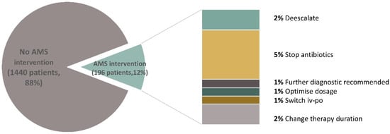 - Dik, J.W.; Hendrix, R.; Lo-Ten-Foe, J.R.; Wilting, K.R.; Panday, P.N.; van Gemert-Pijnen, L.E.; Leliveld, A.M.; van der Palen, J.; Friedrich, A.W.; Sinha, B. Automatic day-2 intervention by a multidisciplinary antimicrobial stewardship-team leads to multiple positive effects. Front. Microbiol. 2015, 6, 546. [Google Scholar] [CrossRef]