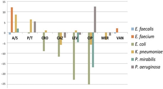 During the intervention, we observed no significant change in the number of analyzed blood cultures and urinary samples (357 vs. 337 blood cultures and 1323 vs. 1318 urinary specimens). The resistance rate of E. coli isolates against ceftriaxone, ceftazidime and quinolones declined in the AMS period. This phenomenon was most prominent for levofloxacin and ciprofloxacin, with a drop of almost 25% (from 26% to 18.6% for ciprofloxacin). In contrast, we observed slight increases (10%) in the ampicillin/sulbactam resistance rates of E. faecium and K. pneumoniae isolates and a minimal raise (5%) in the piperacillin/tazobactam resistance rates of K. pneumoniae and P. aeruginosa isolates (Figure 3). Surprisingly at first glance, there were around 12% more P. aeruginosa isolates resistant to ciprofloxacin in the AMS period, despite a dramatic drop in prescriptions (Figure 3). When revising the medical charts in more detail, however, it became clear that these patients had acquired the infections outside the hospital.
