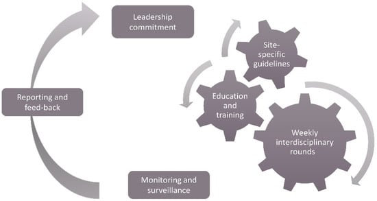 Hannover Medical School is a 1520-bed maximum care academic hospital with a nationwide catchment area, and approximately 2000 patients are treated yearly in the Urology Department. An AMS intervention was implemented in the Urology Department from 1 January through 31 December 2020 and involved a bundle-of-care consisting of site-specific guidelines, education and training as well as weekly interdisciplinary rounds. Urologists, infectious disease physicians, microbiologists and pharmacists developed site-specific antimicrobial guidelines for perioperative antibiotic prophylaxis and the management of urologic infections based on local antimicrobial resistance patterns and on the national and international recommendations (Table S2) [26,32,33,34]. The guidelines additionally contained preferred and alternative empiric antimicrobial choices as well as duration of therapy recommendations. They also include recommendations on adjusting the therapy based on microbiological results and describe specific perioperative regimens tailored for every type of surgical intervention. Due to increasing resistance rates and to their potential for long-lasting adverse effects, quinolones were not recommended for empiric treatments and were excluded from the perioperative prophylaxis regimens in favor of ampicillin/sulbactam. The rollout of the new guidelines was accompanied by educational and training sessions for urologists. The weekly rounds were performed by an interdisciplinary team (clinical microbiologist, infectious diseases specialist, and pharmacologist) that discussed the current therapies with the bedside physician (Figure 4). The antibiotic regimens and the available diagnostics were reviewed, and recommendations on the continuation, medication switch, additional diagnosis, dosage adjustment or drug trough-level measurements were made. However, the urologists maintained prescribing autonomy. The AMS team also offered support between the standard rounds if necessary. Data on antibiotic prescriptions and resistance patterns were monitored by the hospital’s pharmacy and microbiology department, respectively, and were reported on a regular basis to each clinical department.
