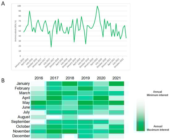 Public interest in the term “antimicrobials” based on Google Trends data. (A) Relative search volume over time from January 2016 to December 2021. (B) Heatmap showing the intensity of monthly public interest per year.
