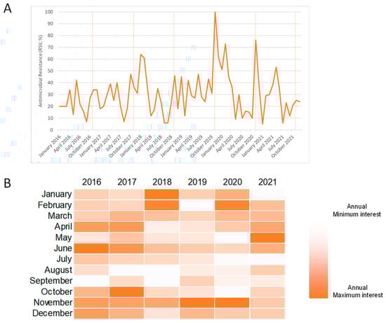 Public interest in the term “antimicrobial resistance” based on Google Trends data. (A) Relative search volume over time from January 2016 to December 2021. Vertical orange lines correspond to the months when WAAWs occurred; (B) heatmap showing the intensity of monthly public interest per year.