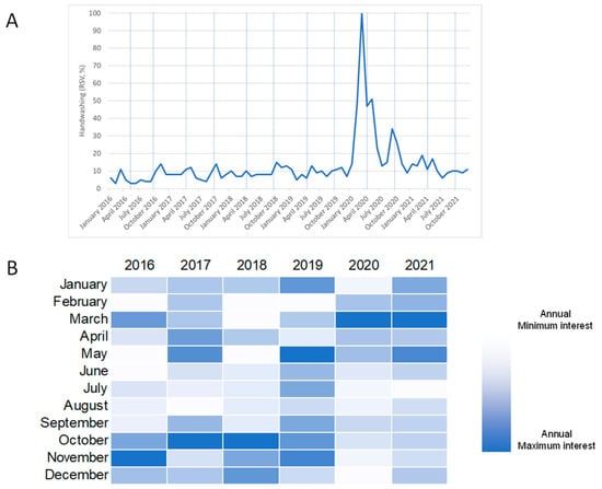Public interest in the term “handwashing” based on Google Trends data. (A) Relative search volume over time from January 2016 to December 2021. Vertical blue lines correspond to the months when annual campaigns occurred; (B) heatmap showing the intensity of monthly public interest per year.