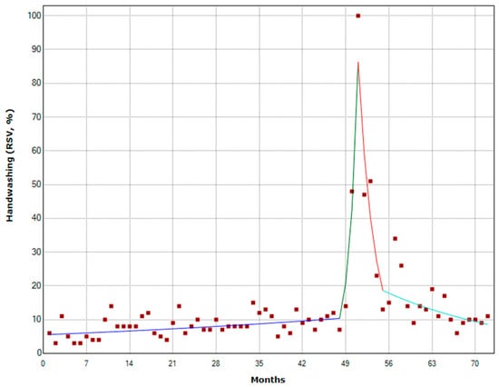 Figure 4A illustrates monthly public interest in the term “handwashing” from 1 January 2016 to 31 December 2021. For each year, the annual peak of interest occurred in November 2016, October 2017 and 2018, May 2019, and February 2020 and 2021 (Figure 4B). The WHHD is celebrated on 5 May, while GHD is on 15 October. Overall, public interest reached its peak in March 2020 and the analysis detected three joinpoints around this peak (Figure 5). From January 2016 to December 2019, public interest remained relatively stable (MPC = 1.3%) and then sharply increased up to a peak in March 2020 (MPC = 102.6%). Then, public interest rapidly declined until August 2020 (MPC = −31.8%), and then slowed until December 2021 (MPC = −4.4%). The analysis of weekly trends in public interest produced similar results (data not shown).