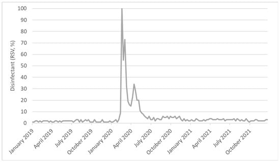 Figure 6 illustrates weekly public interest in the term “disinfectant” from 1 January 2019 to 31 December 2021. The analysis was limited to this period since public interest was extremely low before 2019. In general, interest in this term was low until early 2020 and then increased in the following months. In particular, public interest remained stably low until the 57th week (26 January–2 February 2020; WPC = −0.3%), but then rapidly increased until its highest peak in the 62nd week (1–8 March 2020; WPC = 246.4%). Since that point, public interest decreased moderately at first (until 28 June–5 July 2020; WPC = −13.1%) and then remained stable until the end of 2021 (WPC = −0.1%).