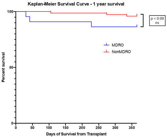 Kaplan–Meier Survival Curve at 1-year of survival of patients with MDRO infections compared to those with no MDRO infection. No significant difference in survival was found.