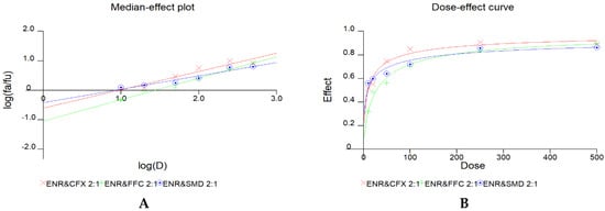 The combined toxicity of ENR-CFX, ENR-FFC, and ENR-SMD was calculated. The drugs were initially mixed at the concentration ratio of 1:1 in six different dose groups. CalcuSyn2.0 software was again used to calculate the dose–effect curves, median-effect plots, and CI values for the binary combination in Figure 1C–H. All the curves correspond well with the median-effect equation of Chou with a correlation rate of over 0.88.