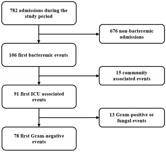 We defined GN-BSI whenever there was a positive blood culture for a GN microorganism, and the patient presented clinical and laboratory indices of infection. Index day was the day of collecting the first positive blood culture (index culture) that recovered a GN isolate. ICU-associated GN-BSI was further defined as the first bacteremic episode under two circumstances: (1) When the index culture was collected after two days in the ICU [23]; (2) We also included earlier onset events if the patients had been treated in an ICU during the previous year, as they likely continued to carry bacteria having similar resistance profiles [24]. In the case of a prior ICU stay, the patient should have been discharged from the ICU at least one month before the current readmission to be considered a first bacteremia event. Therefore, it was less likely to misclassify a bacteremia recurrence as a first event. We defined recurrent bacteremia, sepsis, and septic shock accordingly [25,26]. We examined only the first GN bloodstream infection.