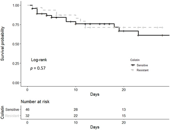 Twenty-eight-day mortality post-event was overall 26.9%, and the Kaplan–Meier curves did not reveal any difference between the colistin-sensitive and the colistin-resistant groups (log-rank test, p = 0.57) (Figure 2). The corresponding 28-day mortality of the carbapenem-resistant Acinetobacter baumannii and Klebsiella pneumoniae infected patients was 34.5% and 28.6%.