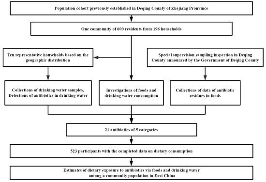Based on the population cohort which had been previously established in Deqing County of Zhejiang Province, which is located in Taihu basin of Yangtze Delta, China, one community was randomly sampled in this study. A total of 600 local residents from 194 households (aged 18 years or above, living in the study regions for more than 6 months and having no plan to move out) were recruited in this study in June 2019. Those with serious body diseases such as cardiovascular and cerebrovascular diseases and liver and kidney diseases were excluded. Each subject was required to fill out a questionnaire regarding their demographic and social-economic characteristics, and was asked to complete a food frequency questionnaire regarding the consumption of drinking water and common foods. Drinking water samples were collected at the same time. Finally, 523 subjects with the completed data of dietary consumption were eligible for the final analysis. The response rate was 87.2%. A flow chart of the process is presented in Figure 1. Written informed consent was obtained from all subjects before data collection. This study was reviewed and approved by the Institutional Review Board of Fudan University School of Public Health (number: 2019-03-0733, date: 18 March 2019).