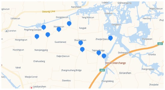 The concentrations of antibiotics in drinking water were mostly around the magnitude of part per billion (ppb), equal to ng/L. Due to the relatively low detection rates of antibiotics in bottled water and barreled water (the corresponding concentrations were less than 0.001 ng/L), as explored in Ref. [9], we only collected tap-water samples in the current study. Based on the geographic distribution, 10 of 194 households were selected to provide a bottle of 2 L tap water as a sample at around 9 a.m. to 10 a.m. for seven consecutive days, respectively (Figure 2). All samples were kept in −20 °C and analyzed within two days.