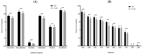 Comparison of the dietary exposure contents to antibiotics between male and female: (A). the five categories of antibiotics and the sum of all antibiotics; (B). the top ten kinds of antibiotics with the highest median contents (EFX: Enrofloxacin; SMZ, Sulfamethazine; OTC: Oxytetracycline; TCN, Tetracycline; TMP: Trimethoprim; OFX: Ofloxacin; FLN: Florfenicol; CLP: Chloramphenicol; TPN, Thiamphenicol; TMC, Tilmicosin.). ** 0.05 < p < 0.01; *** p < 0.001.