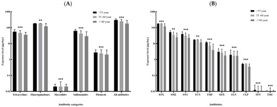 Comparison of the dietary exposure contents to antibiotics between subjects less than 35 years, 35–60 years and more than 60 years: (A). the five categories of antibiotics and the sum of all antibiotics; (B). the top ten kinds of antibiotics with the highest median of contents (EFX: Enrofloxacin; SMZ, Sulfamethazine; OTC: Oxytetracycline; TCN, Tetracycline; TMP: Trimethoprim; OFX: Ofloxacin; FLN: Florfenicol; CLP: Chloramphenicol; TPN, Thiamphenicol; TMC, Tilmicosin.). ** 0.05 < p < 0.01; *** p < 0.001.