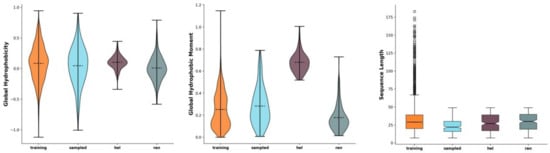 We have chosen 200 as the number of sequences to sample from the model after training, but two of the sequences were shorter than seven amino acid residues. As such, finally, 198 novel peptide sequences were generated (Figure 1, file “Sampled peptides.csv” in the supplementary information). The generated 198 sequences were also compared to random sequences with the same amino acid distribution (as the training set) (file “random_sequences.fasta” in the supplementary Information) as well as to manually generated, presumably helical sequences (file “helical_sequences.fasta” in the Supplementary Information) [] (Figure 1).