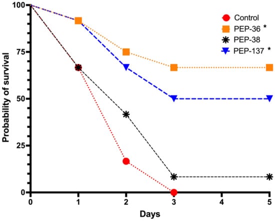 Comparison of probability of survival (%) in each group: control (sterile saline), PEP-36, PEP-38 and PEP-137. The peptides were injected once in a dose of 100 μg 30 min after infection of mice with 6.75 × 108 CFU suspension of a carbapenem-resistant isolate of K. pneumoniae. *—significant differences from the control group using the Kaplan-Meier method and Log-rank (Mantel-Cox) test.