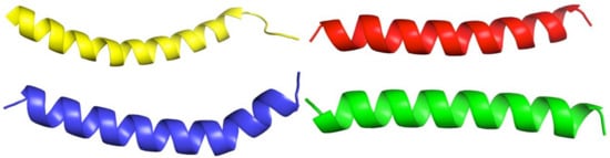 Visual comparison of the structures of LL-37 (yellow; PDB ID: 2K6O) and synthesized peptides: PEP-137—blue, PEP-38—red, PEP-36—green (by AlphaFold).
