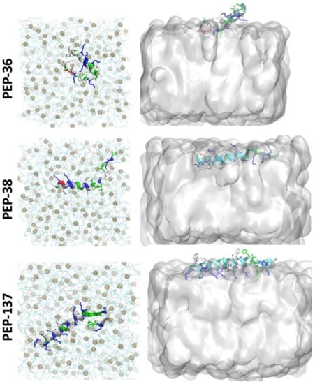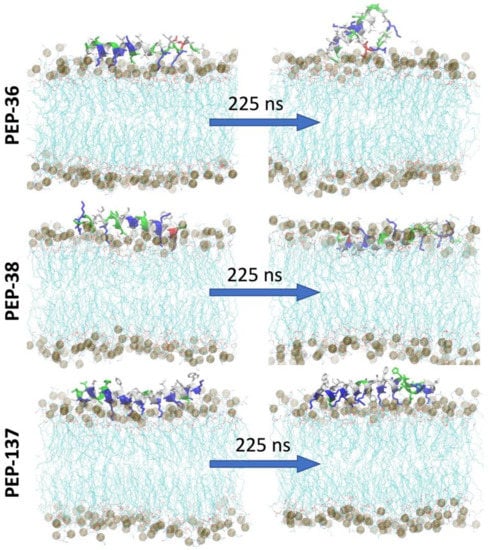 According to MD results, among three peptides, PEP-38 is more promising in terms of penetrating the bacterial membrane, and hence it could be capable of producing membrane lysis. As PEP-137 has a greater number of charged amino acids, it could not penetrate the membrane, since the charged amino acids favor the hydrophilic environment in membrane surface.