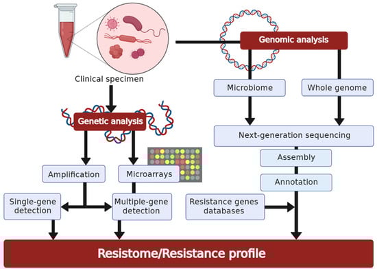 The basic workflow of molecular-based techniques for antimicrobial susceptibility testing. The routes from a clinical specimen to a final result are indicated by arrows (created with BioRender.com, accessed on 27 February 2022. Reproduction of this figure requires permission from BioRender.com).