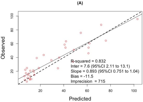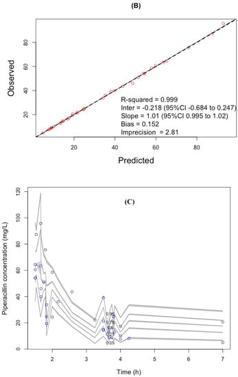 An external validation was performed on the final covariate model using two non-Brazilian, critically ill patient populations. The model was applied to data obtained from a study in (A) critically ill Australian patients, and (B) critically ill Indigenous Australian patients (Figure 3) [16,17]. In the external validation a lower precision (root mean square prediction error, RMSPE) was observed when testing concentrations that were within the concentration range of the original dataset (<100 mg/L; Table 4).