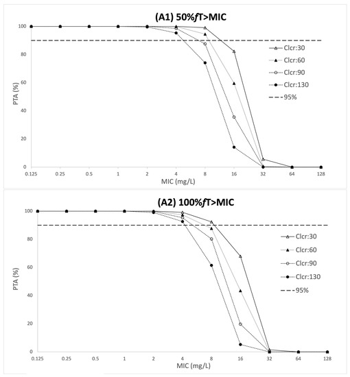 PTA was determined for a steady state dosing interval only. The fractional target attainment (FTA), during the steady state dosing interval, was calculated for P. aeruginosa based on the MIC distribution of the European Committee for Antimicrobial Susceptibility and Testing (EUCAST) database (available at www.eucast.org accessed on: 25 October 2021). FTA was calculated considering MIC distribution within the susceptibility range defined by clinical breakpoints (16 mg/L for P. aeruginosa). Doses were considered optimal if the FTA was greater than 85%.
