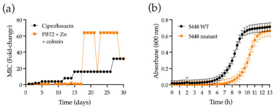 Resistance development against PBT2, zinc, and colistin. (a) Development of resistance by GAS strain 5448 during serial passage with colistin in the presence of sub-inhibitory concentrations of PBT2 and zinc (Zn) in CA-MHB supplemented with 2.5% (v/v) lysed horse blood. (b) Bacterial growth of GAS 5448 resistant mutant (PBT2 + Zn + colistin) compared to wild-type (WT) GAS 5448 in Todd-Hewitt broth supplemented with 1% (w/v) yeast extract. Growth curves are representative of three biological replicates.