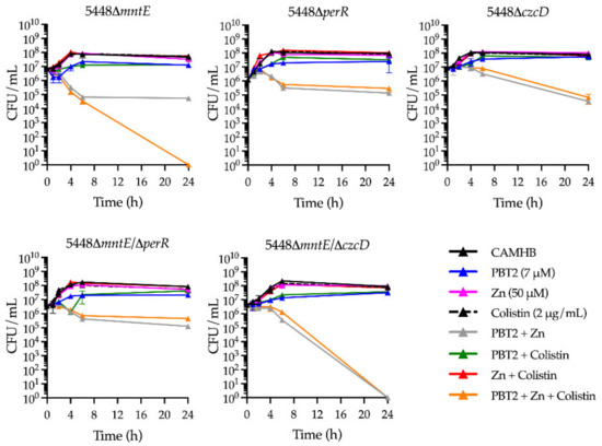 In the presence of zinc, PBT2 has been previously shown to induce intracellular zinc intoxication and manganese depletion in S. uberis and S. pneumoniae [30,31]. As such, quantitative real-time PCR was employed to examine potential transcriptional changes in the zinc-exporting cation diffusion facilitator gene czcD; mntE, a manganese-specific efflux pump paralog of czcD involved in oxidative stress; and mtsA, the gene encoding the solute-binding protein for the manganese-importing ATP-binding cassette transport pathway. Treatment with PBT2 in the presence and absence of zinc and/or colistin resulted in the upregulation of both czcD and mntE, and downregulation of mtsA (Figure 3b).