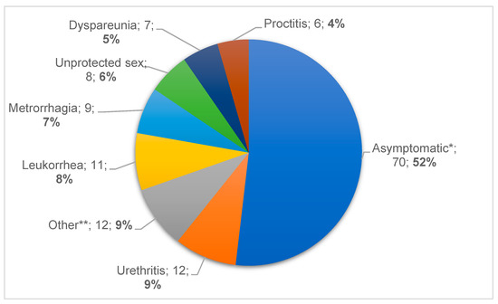 Symptoms and signs of patients included during the prospective phase of the study (Symptom, n, %). * Asymptomatic section includes STI contacts and patients with previous unprotected sex. ** Other: dysuria (n = 4), pruritus (n = 4), infertility (n = 2), test of cure (n = 1), amenorrhea (n = 1).